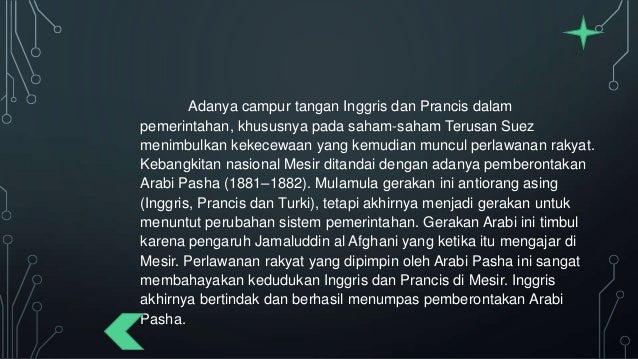 Dari sini bisa dikatakan bahwa masyarkat Mesir merupakan masyarakat yang keras dan radikal. LATAR BELAKANG Krisis Keuangan MesirSejak dibukanya Terusan Suez pada tahun 1869 negara-negara Baratterutama Inggris dan Prancis saling berlomba. Bagaimanapun faktor pengaruh agamaperanan golongan intelektualdan peranan pendidikan memberi sumbangan yang ketara terhadap gerakan nasionalisme di negara sungai Nil.