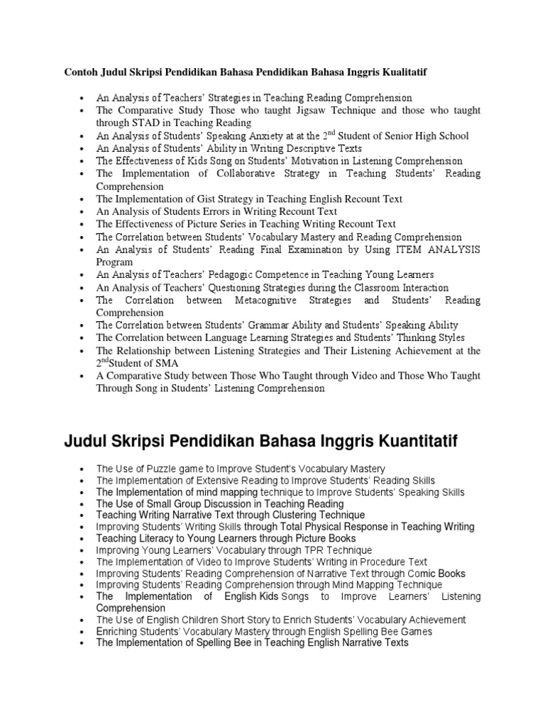 Doc Kumpulan Judul Skripsi Pendidikan Bahasa Inggris Tentang Daftar Judul Tesis Pb S2 100 Contoh Judul Penelitian Kualitatif Terbaru. Berikut informasi sepenuhnya tentang contoh skripsi bahasa inggris kualitatif pdf. Secara bahasa penelitian berasal dari bahasa Inggris yaitu kata reseacrh yang artinya mencari kembali.