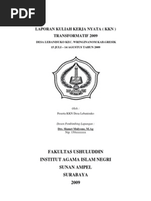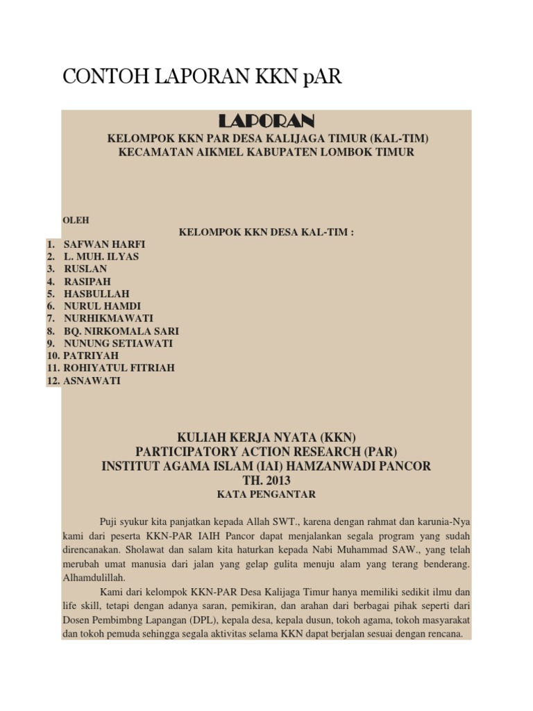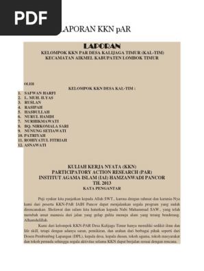 Contoh laporan kkn metode par pdf. Kuliah Kerja Nyata KKN yang diimplementasikan oleh UIN Sunan Ampel Surabaya adalah KKN Integratif mengintegrasikan berbagai disiplin ilmu yang dikembangkan di dalam Universitas untuk menberdayakan masyarakat di samping itu sebagai integrasi Tri dharma Perguruan Tinggi antara Pendidikan Penelitian dan pengabdian Masyarakat. Gaya penulisannya berbeda dengan laporan hasil penelitian. Contoh Halaman Pengesahan Laporan KKN ProfesiTematik Konversi Lampiran 7.