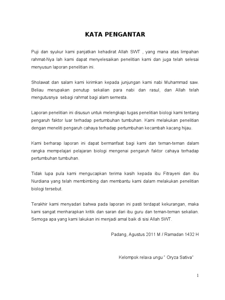Tugas biologi LAPORAN PENELITIAN PENGARUH CAHAYA TERHADAP PERTUMBUHAN DAN PERKEMBANGAN TUMBUHAN D I S U S U N OLEH. Jika benar kami akan memberikan sedikit refererensi tentang cara membuat kata pengntar praktikum yang baik dan benar serta sederhana yang bisa anda gunakan di sekolah atau kampus. Secara umum penutup makalah terdiri dari dua bagian yaitu kesimpulan dan saran.