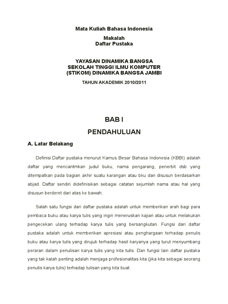 BAHASA INDONESIA 6 BAB II PEMBAHASAN 11 PENGERTIAN Daftar pustaka adalah bagian dari karya ilmiah baik itu artikel skripsi makalah jurnal bukuinternet dan bentuk lainnya yang berisi tentang sumber sumber materi yang digunakan rujukan ataupun referensi baik itu merupakan data yang diambil dari jurnal buku skripsi makalahartikel internet dan sebagainya yang merupakan salah satu elemen yang penting dalam menyusun. Download Contoh Makalah Bahasa Indonesia PDF 1000 MB - SamPDF. Semoga dapat membantu menambah wawasan anda semikian dan terimah kasih.