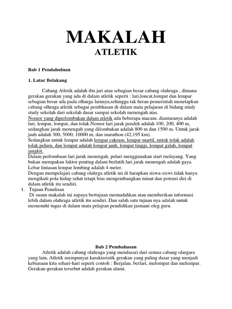 Makalah tentang atletik lari lompat dan lempar. Olah raga Atletik mula-mula di populerkan oleh bangsa Yunani kira-kira pada Abad ke-6 SM. Lompat loncat lempar dan tolak. Saat itu lempar lembing termasuk olahraga populer.